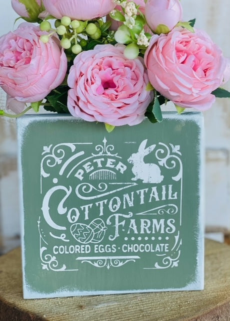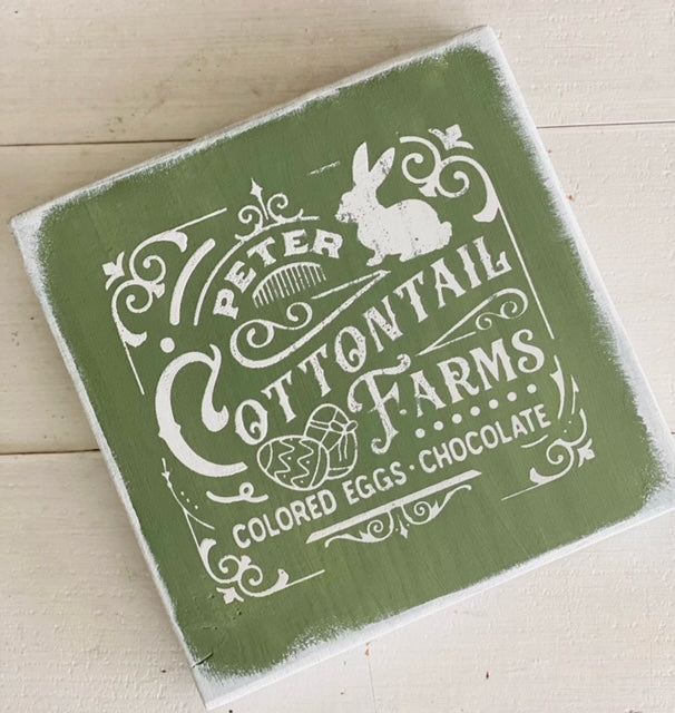 Easter Bunny Cottontail sign, shelf sitter measuring 5x5, perfect for a tiered tray, farmhouse hutch, shelf or fireplace mantel. Color is moss green. Each sign is sanded by hand for a beautiful finish and smooth edges. Because wood is a natural material with natural appearance and variances (grains, knots, and minor faults), and each one is custom painted for you, the exact product may vary slightly from the photo. The signs are created to order, painted and/or stained, and are solely for indoor usage.