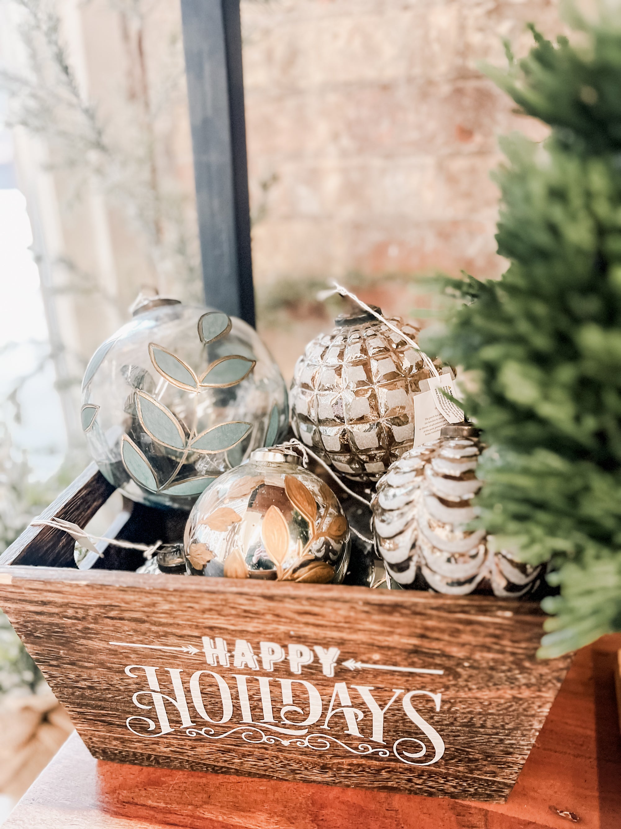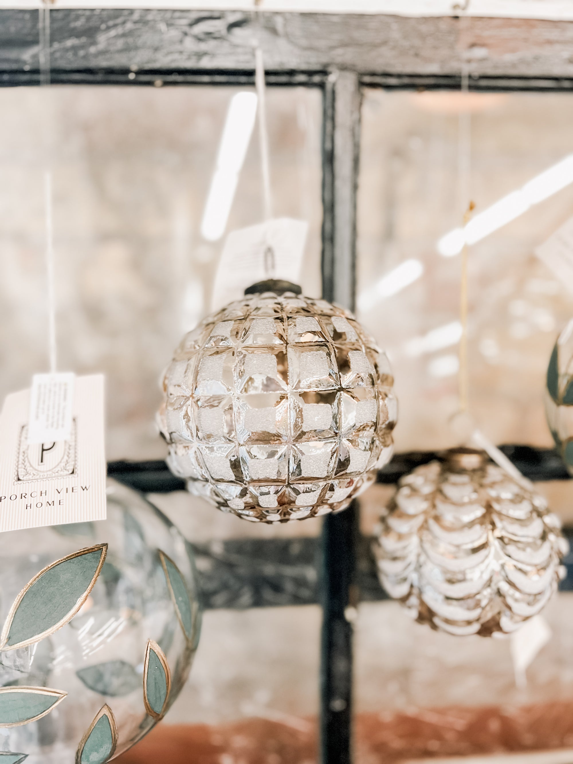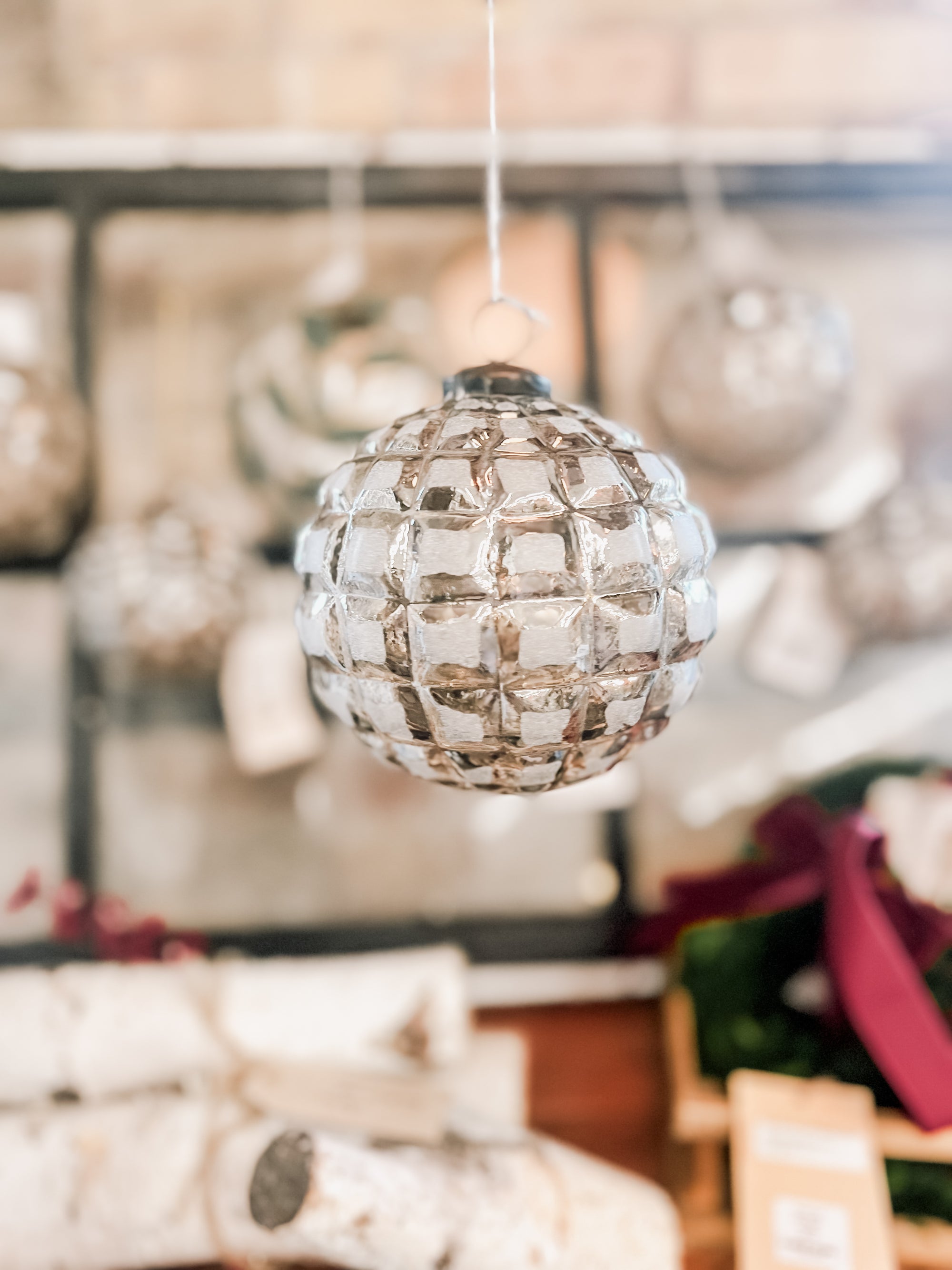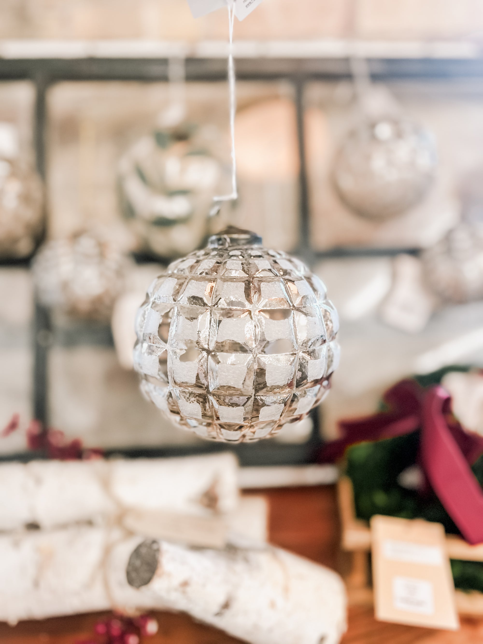 This glass ornament has a faceted pattern that creates a subtle and rich shimmer of reflected light with the color of a frozen winter pond. She's large, sturdy, and would look perfect hanging from the ceiling in your entry way along with our other ornaments, collected in a bowl for your table top decor, or hanging on your master tree that reaches for the sky.