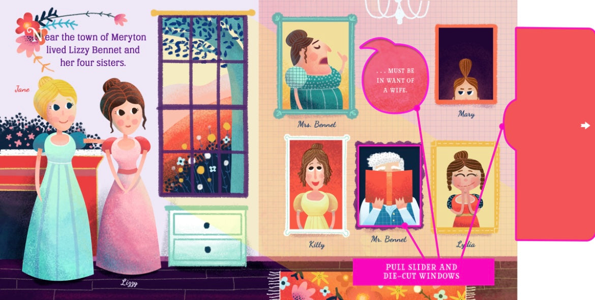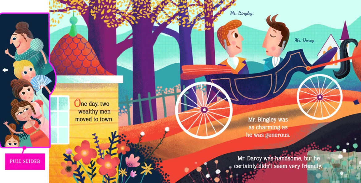 Filled with interactive wheels and pull-tabs and lavishly illustrated, Lit for Little Hands: Pride and Prejudice is an unprecedented kid’s introduction to Jane Austen’s beloved classic novel. Unlike many board books that tackle the classics, Lit for Little Hands tells the actual story in simple, engaging prose. Gorgeous pastoral illustrations transport the reader to the fields and estates of Lizzy’s England, while tons of interactive elements invite kids to spin the dancers at the ball, care for Jane, open a shocking letter, and more! Austen fans will be delighted by the book’s attention to detail and clever use of original dialog. And the book’s use of super-sturdy board means everyone can enjoy this tale of wit and romance over . . . and over . . . and over again!