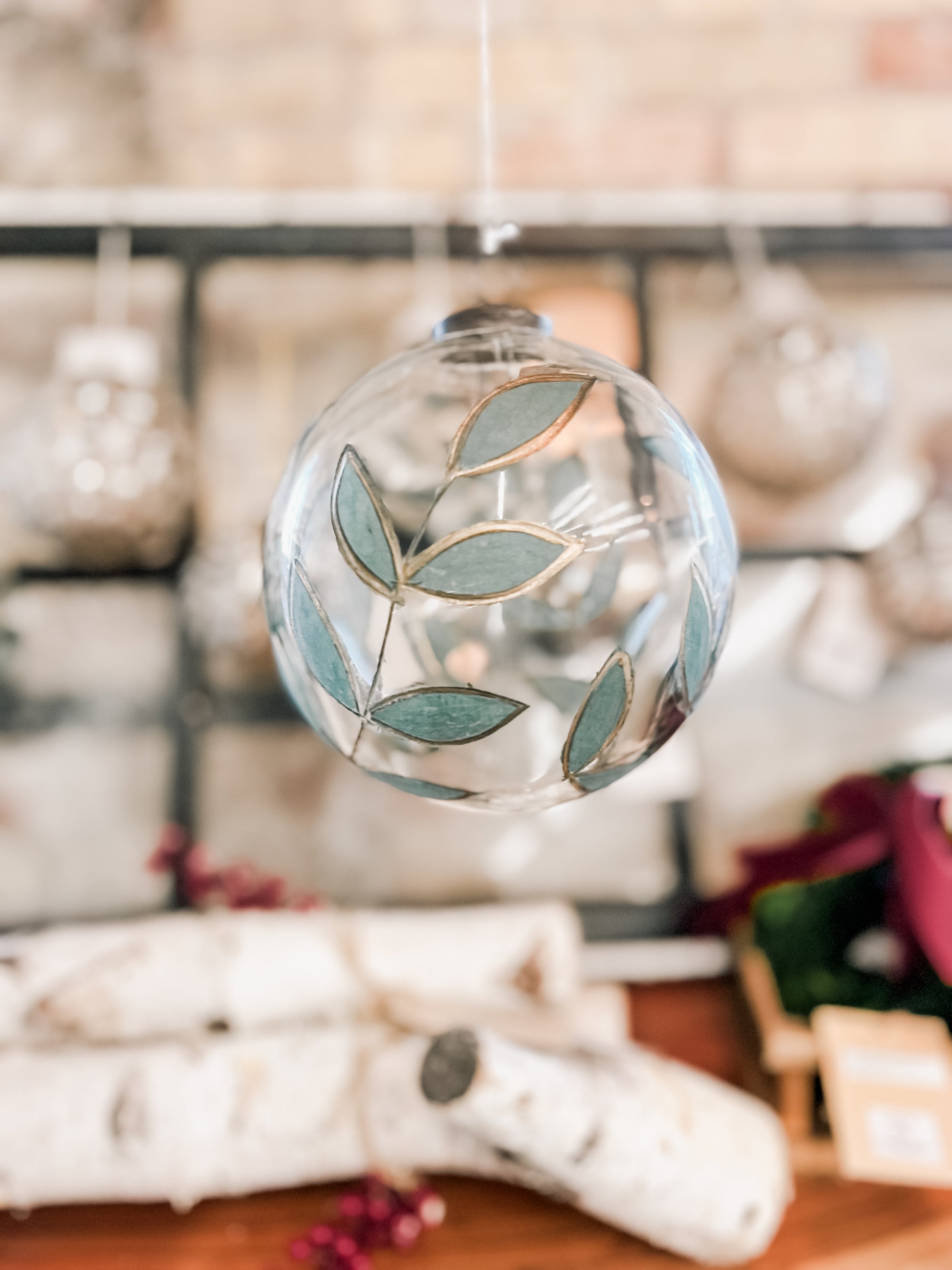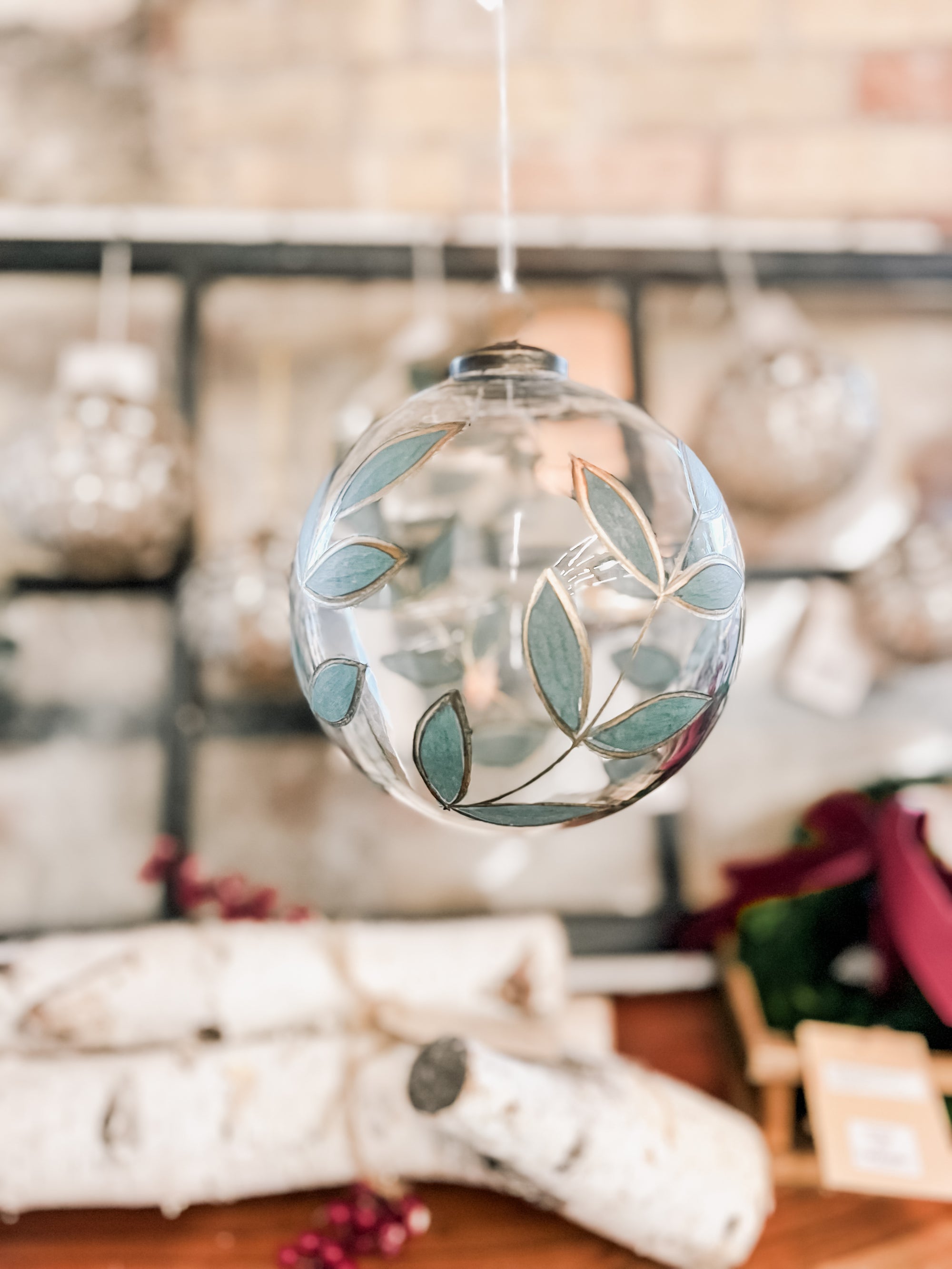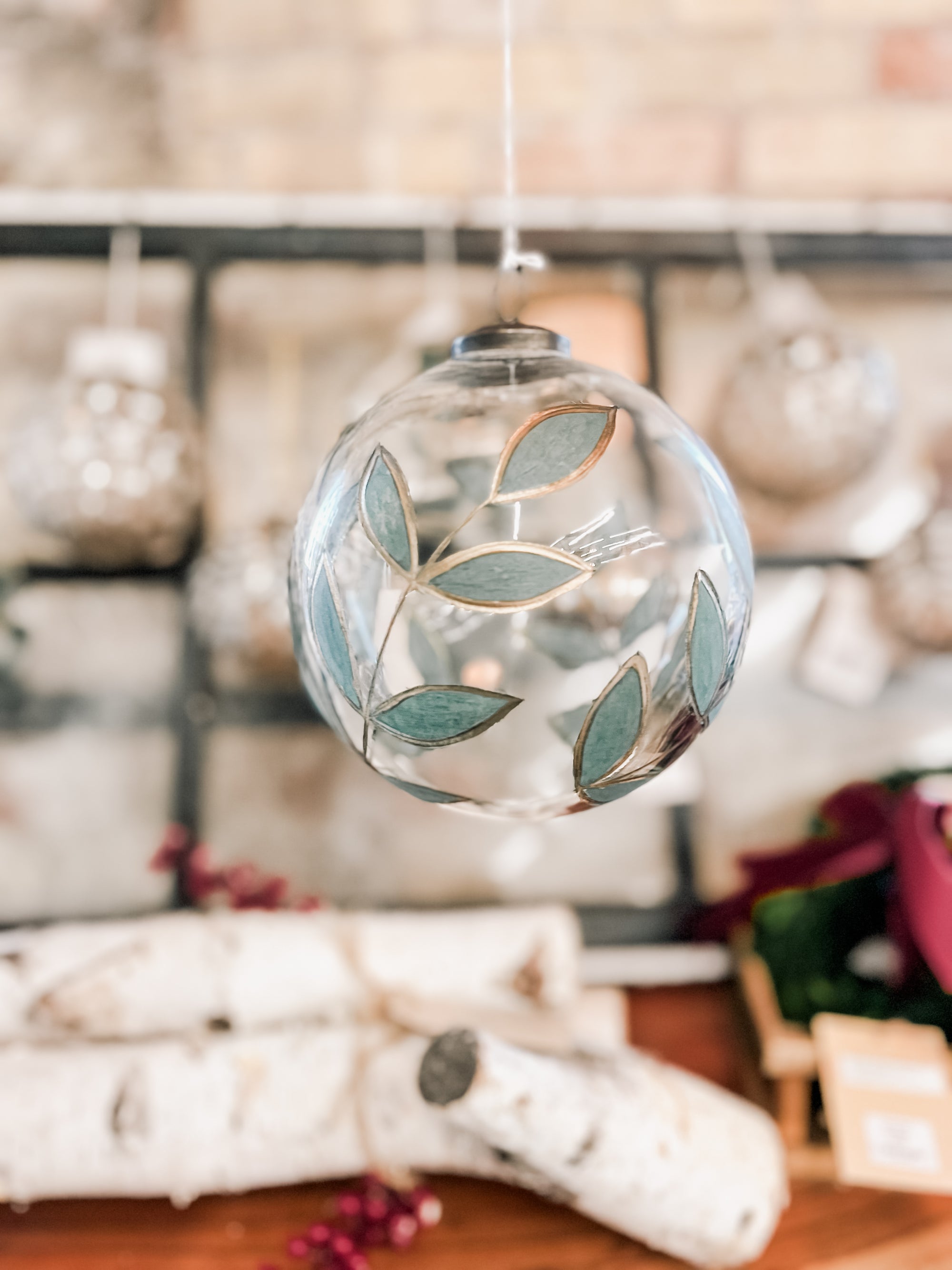 This large clear glass ball is hand-painted in a laurel pattern with a delicate gold edge. She's large, sturdy, and would look perfect hanging from the ceiling in your entry way along with our other ornaments, collected in a bowl for your table top decor, or hanging on your master tree that reaches for the sky.