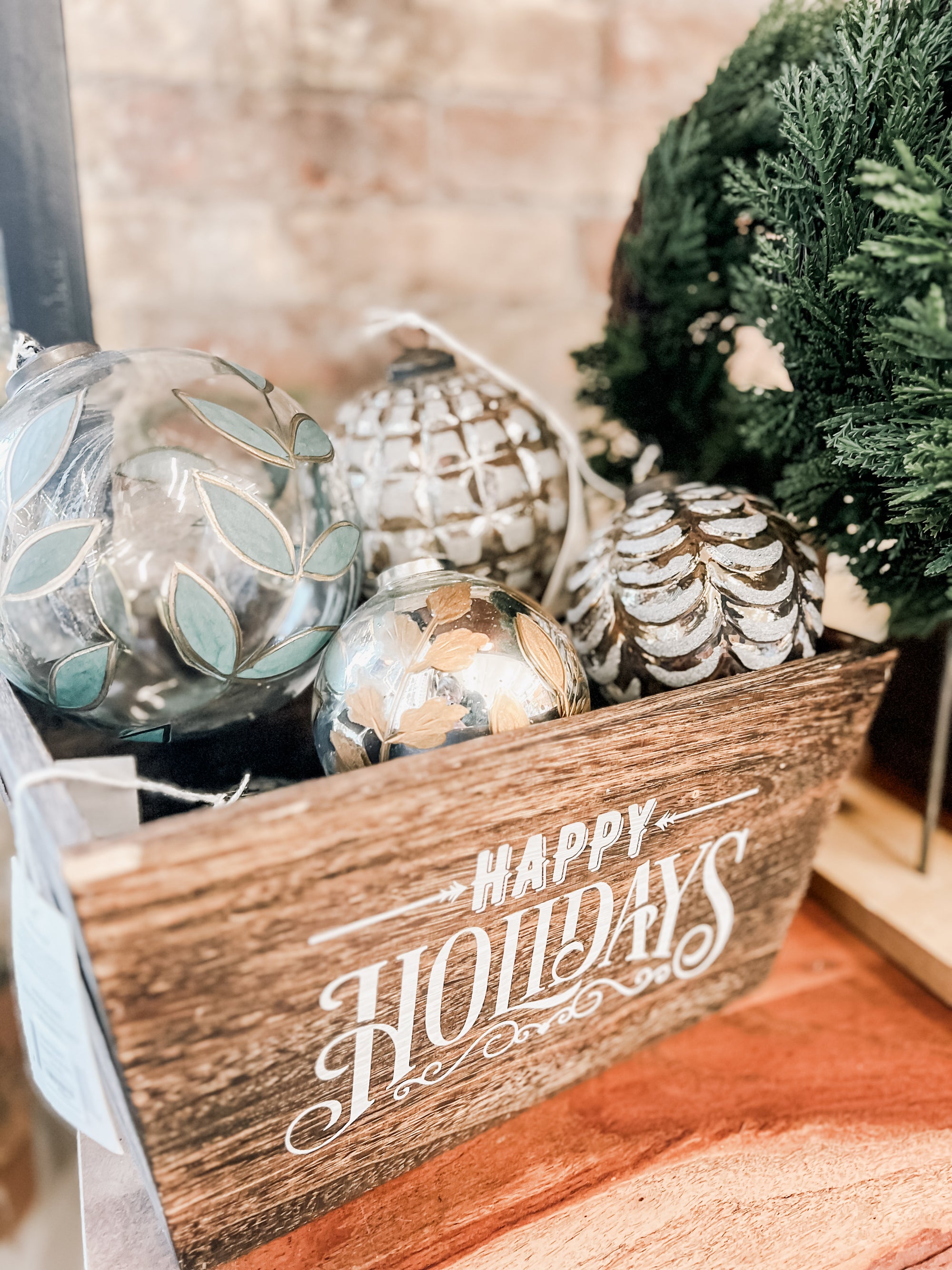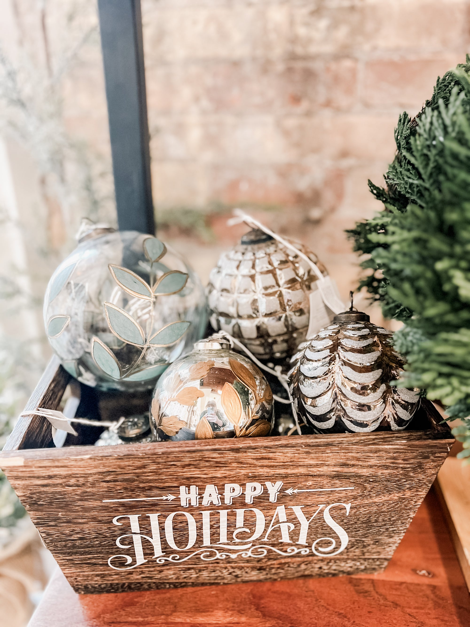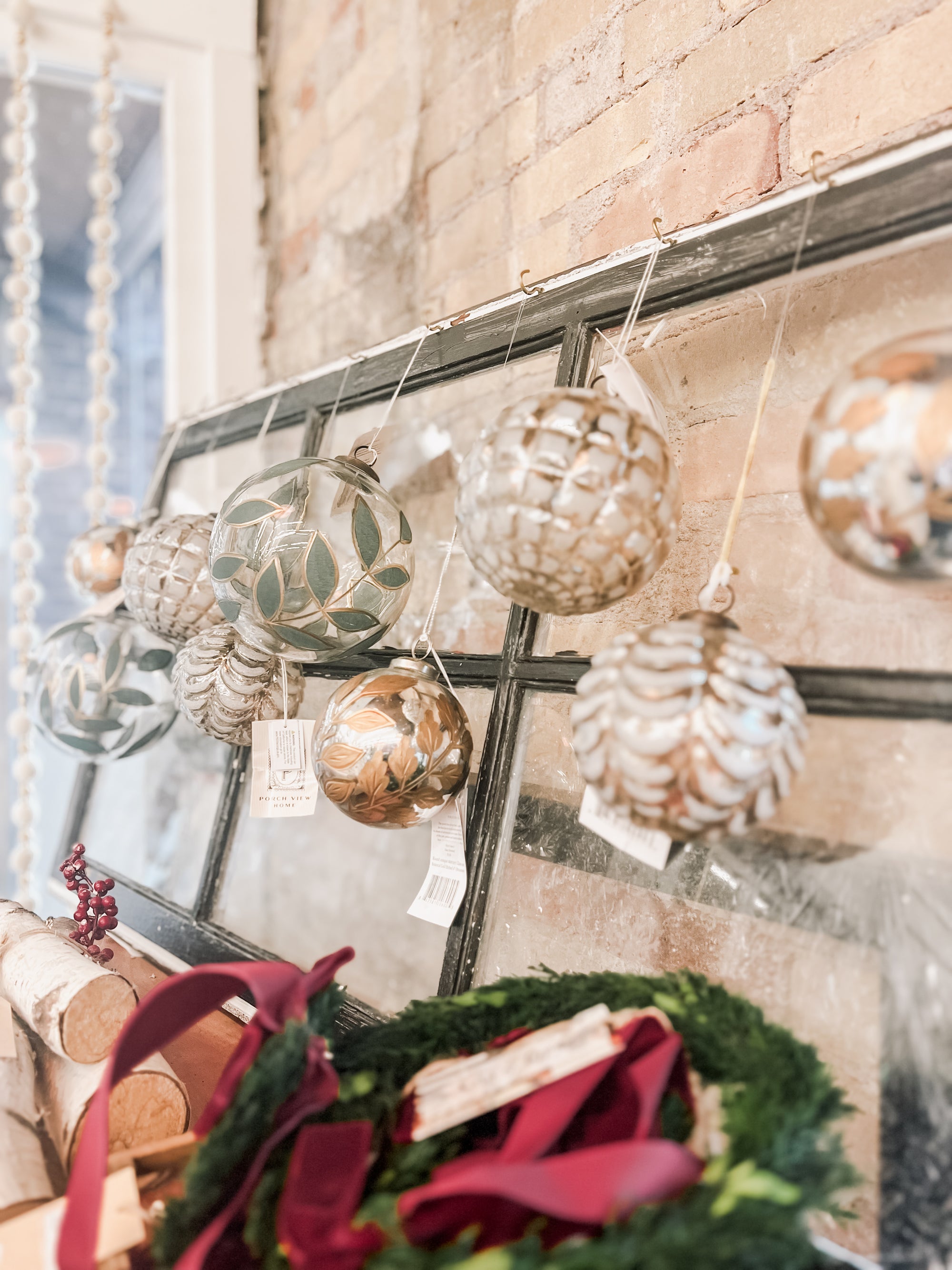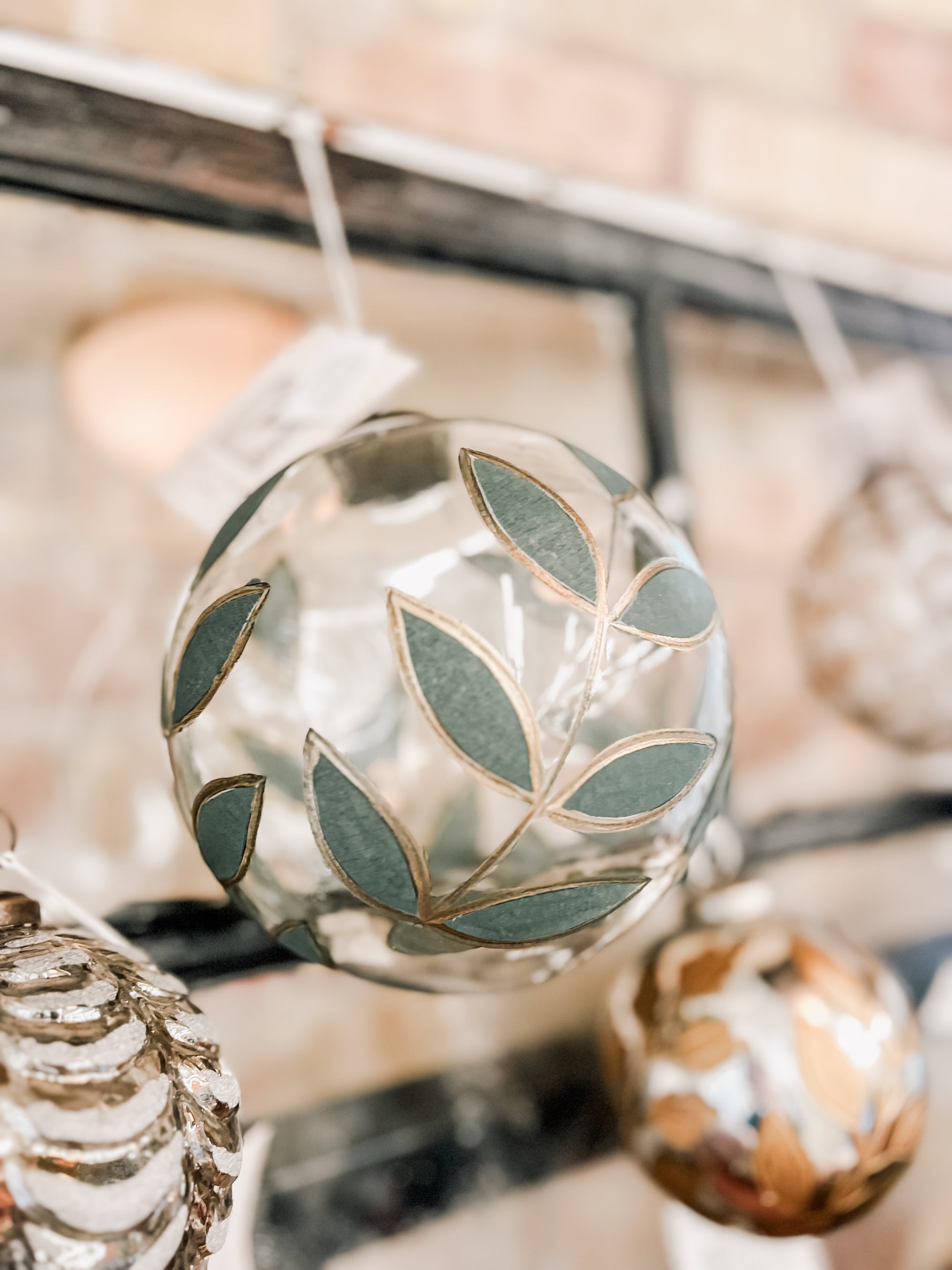 This large clear glass ball is hand-painted in a laurel pattern with a delicate gold edge. She's large, sturdy, and would look perfect hanging from the ceiling in your entry way along with our other ornaments, collected in a bowl for your table top decor, or hanging on your master tree that reaches for the sky.