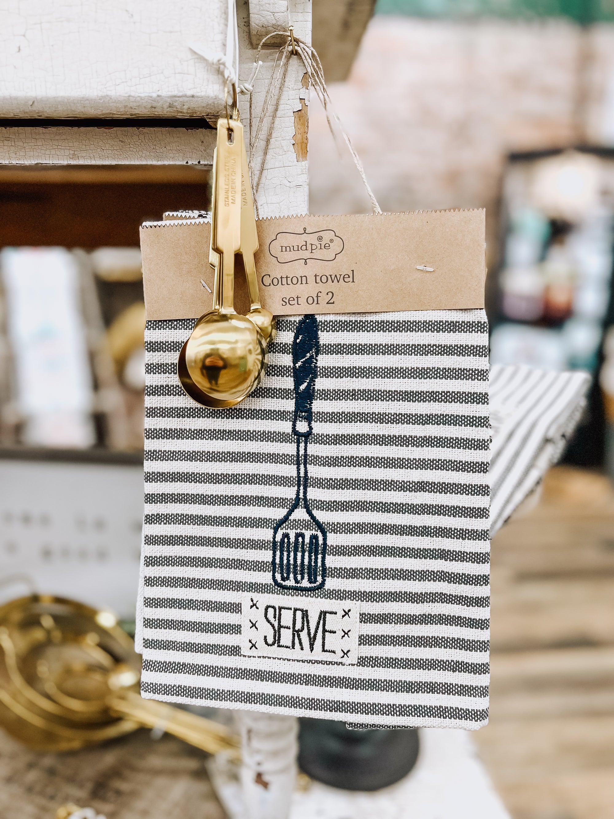 The Serve Bistro Towel Set is a practical and stylish choice for your kitchen. Crafted from 100% cotton, these two hand towels are both soft and absorbent, making them ideal for drying dishes or cleaning up spills. Each towel showcases an embroidered utensil design and a canvas patch, adding a charming touch to your kitchen decor. The set also includes a patterned towel, providing variety and enhancing your collection with style.