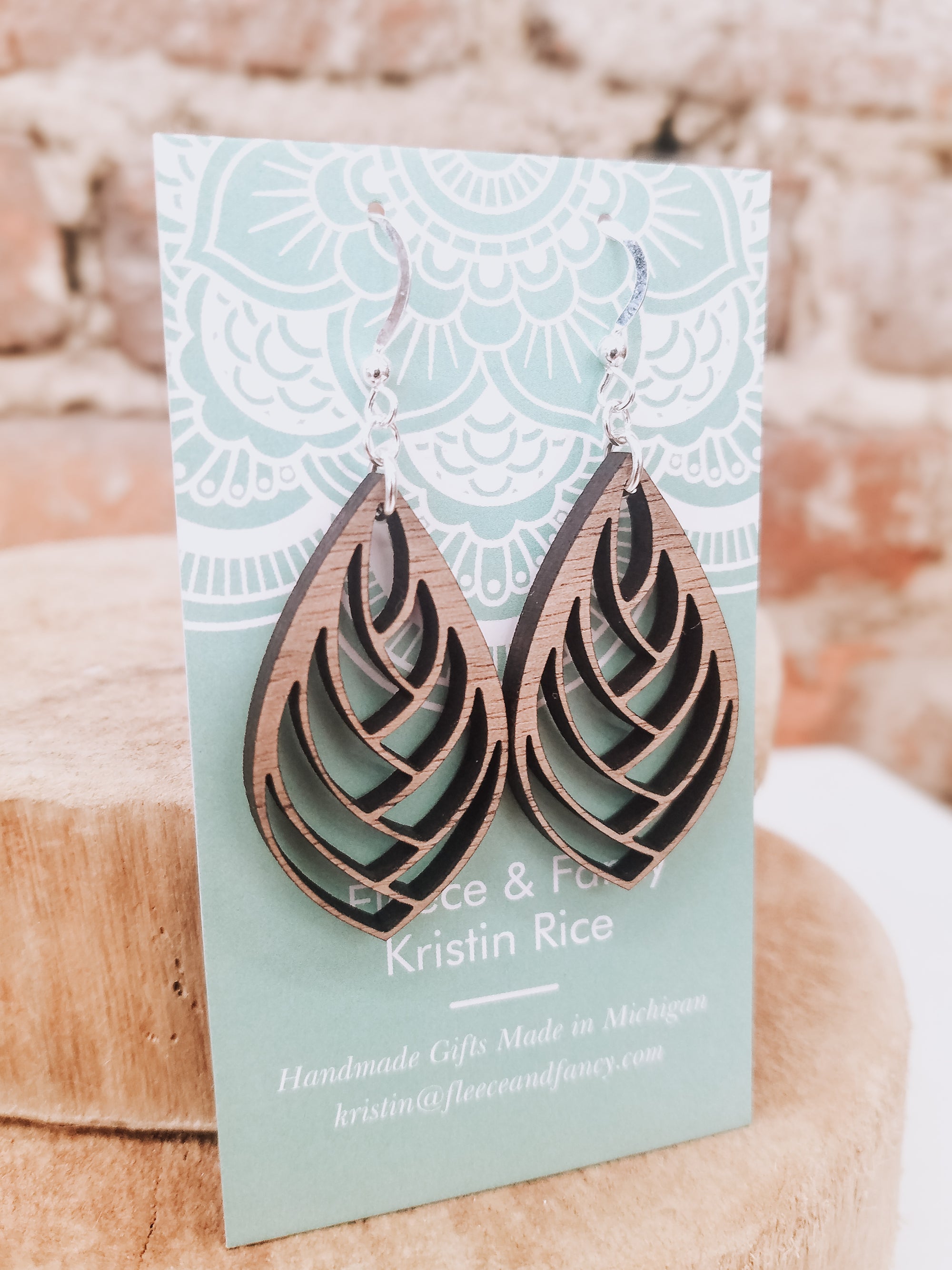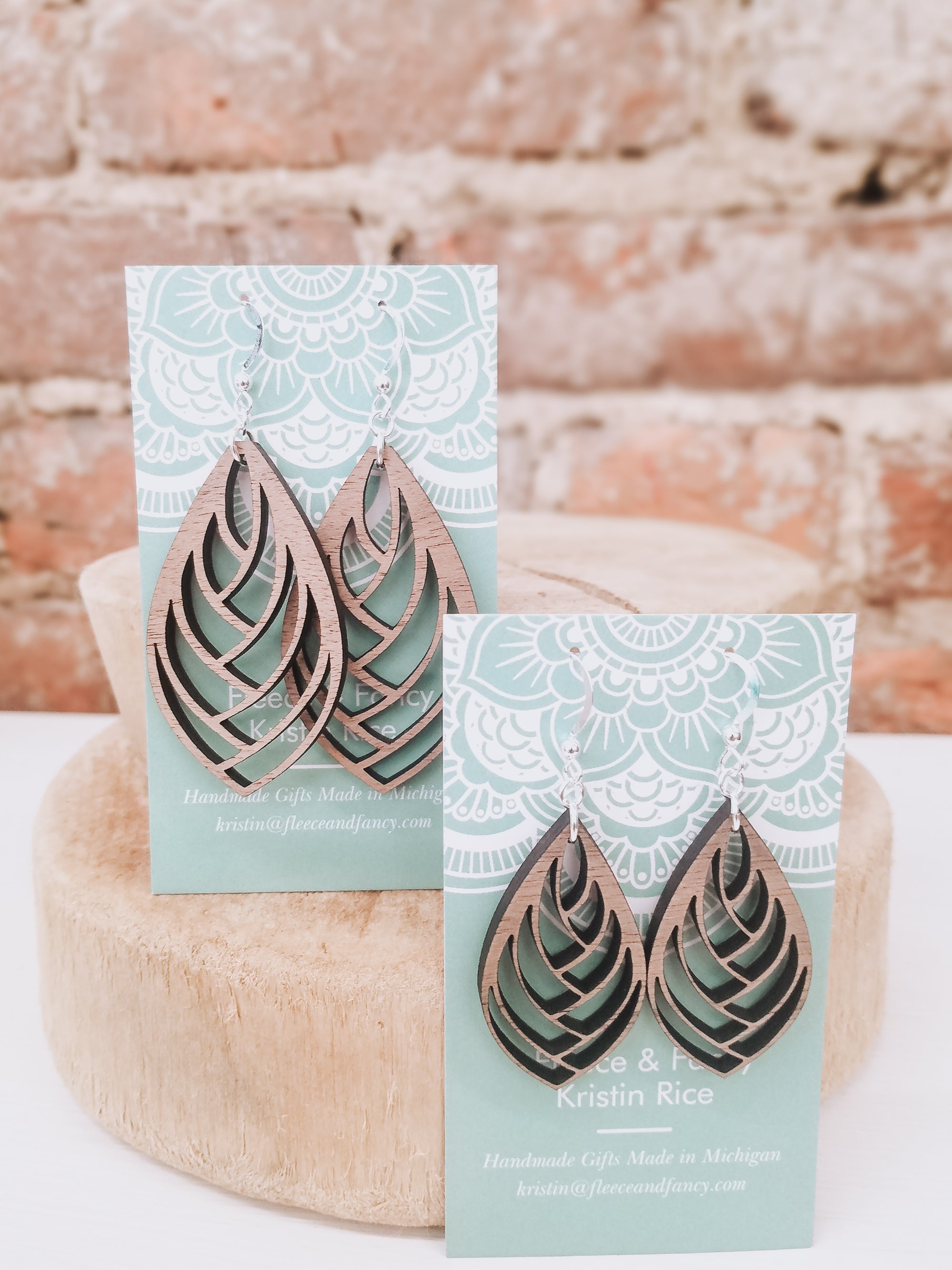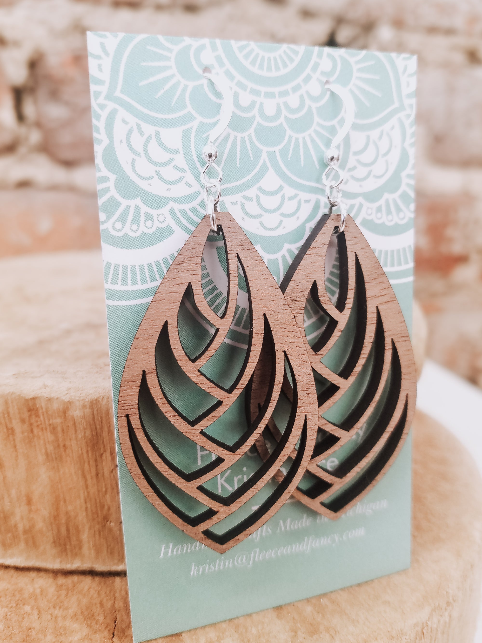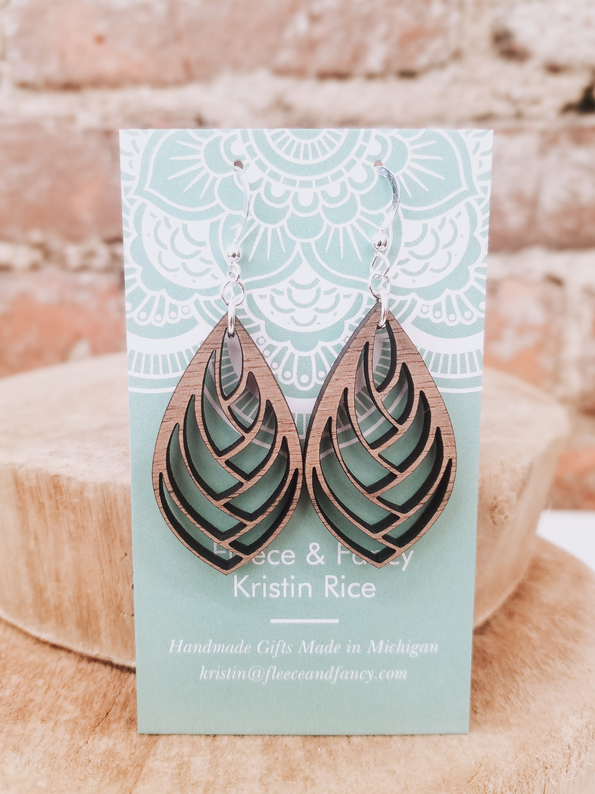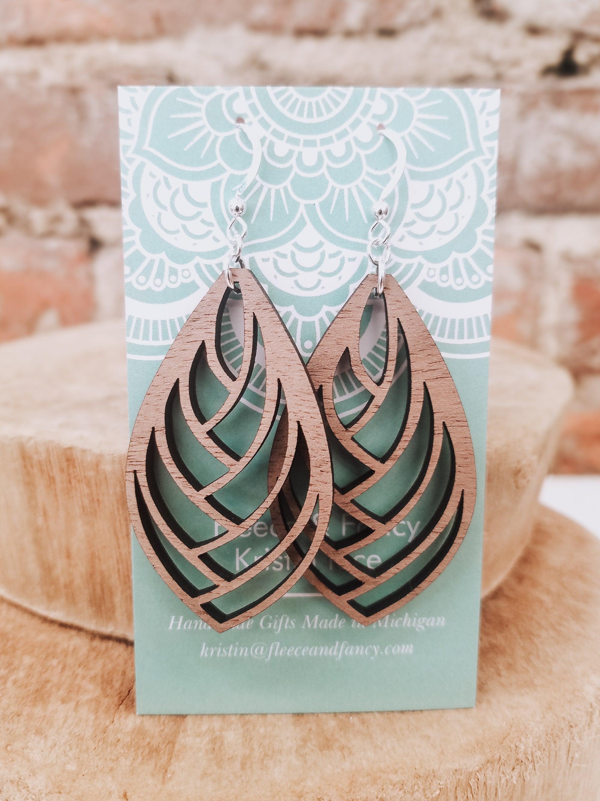 Pinecones have never looked better. With a little extra something, the angled swoops of these wooden earrings create a beautiful statement. They pair not only with a casual outfit, but can tie any fancy outfit together perfectly. Available in two sizes.